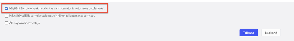 Lisäksi alhaalla on valintaruutu "Käyttäjällä ei ole oikeuksia tallentaa vahvistamatonta ostolaskua ostolaskuksi." Ota valinta kyseisestä ruudusta pois, jos haluat, että ilmainen lisäkäyttäjä pääsee tallentamaan vahvistamattomia ostolaskuja ostolaskuiksi ohjelmassa.