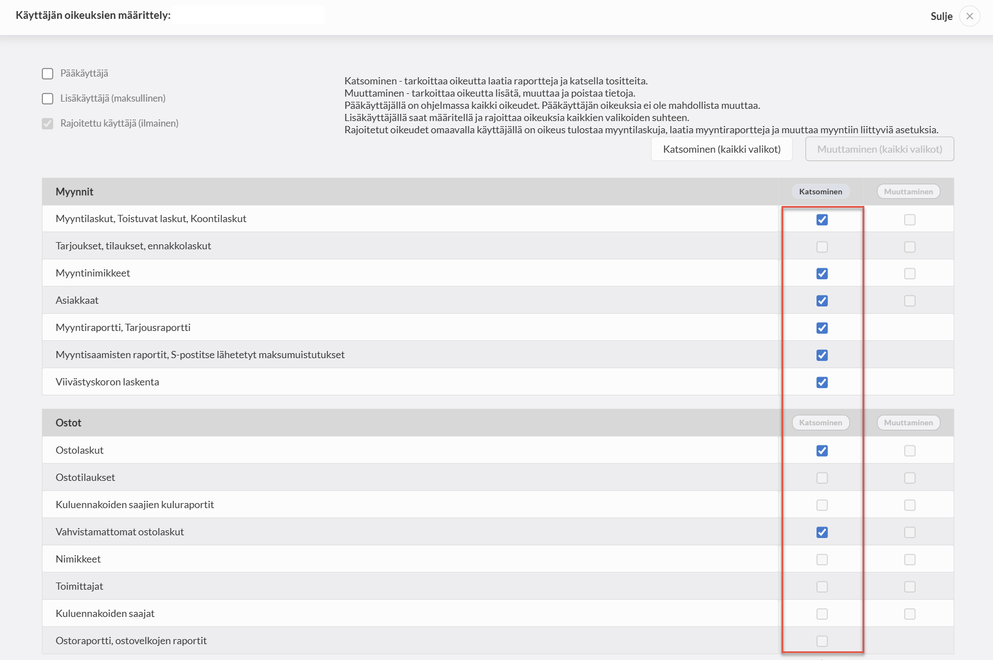 Klikkaa pääkäyttäjänä ohjelmassa Asetukset - Yrityksen tiedot -otsikon alta Käyttäjät - käyttäjän kohdalla Muuta. Laita valinta Ostot-otsikonalta kohtiin Ostolaskut ja Vahvistamattomat ostolaskut sarakkeen Katsominen kohdalta.